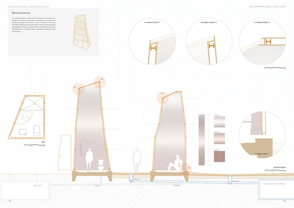 The Earth Observatory is a restroom renovation project along I-80 that challenges negative views of public restrooms as "dark, dirty, and unsafe." It combines functional rest-stop needs with scenic beauty inspired by muddy land and salty water interaction. An element filter installation creates an immersive, playground-like experience, encouraging reflection on our treatment of the land. The design's shifting elements and carefully arranged routes foster a deeper connection to nature, transforming stereotypes of functional spaces.